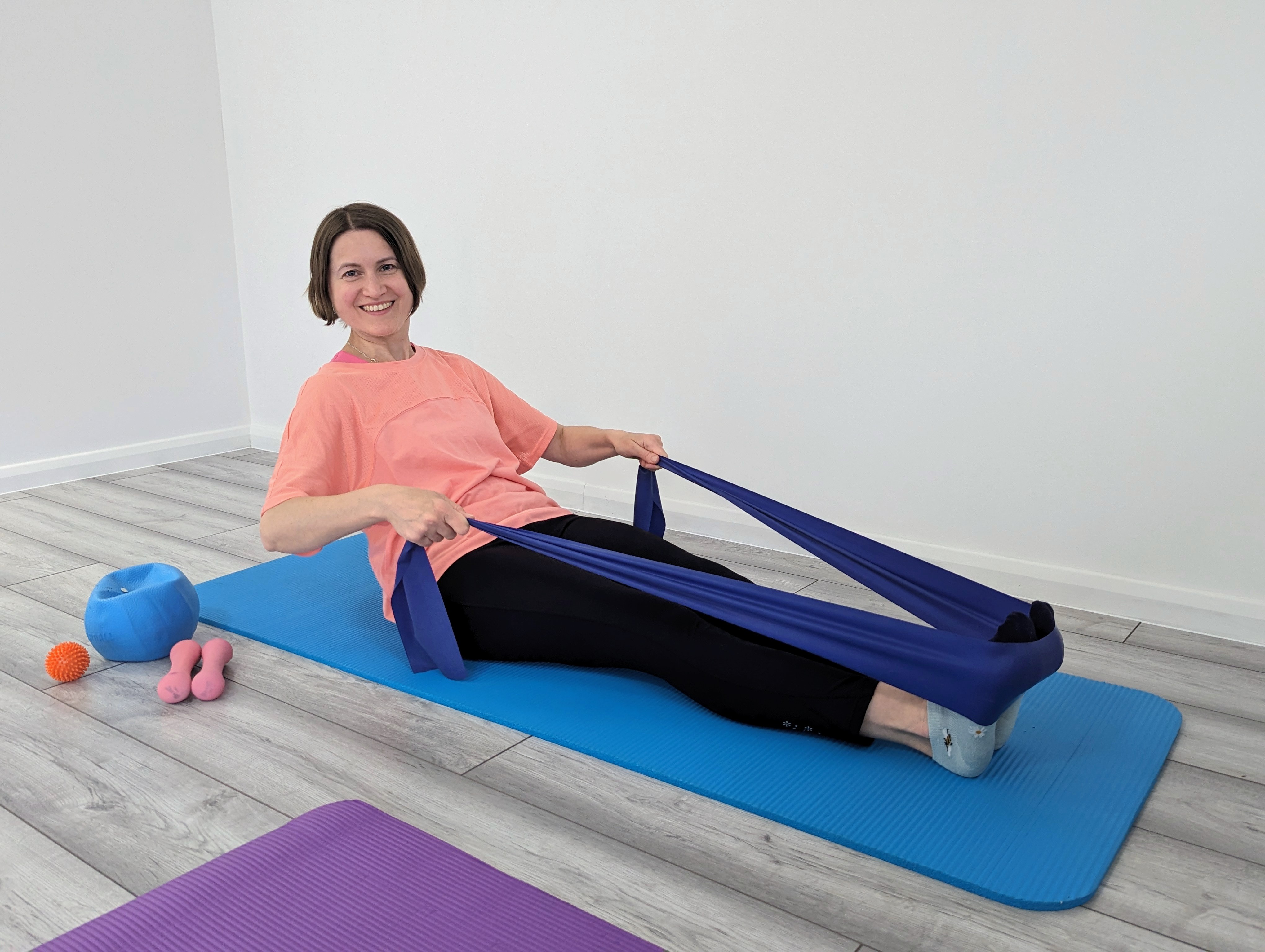 Several people asked me about the blue soft ball (also known as Pilates overball) we use in the classes. I love using them. It’s such a versatile little prop that can be used in many ways. You can easily adjust its size — usually more deflated when placed under the pelvis, and fuller when used…